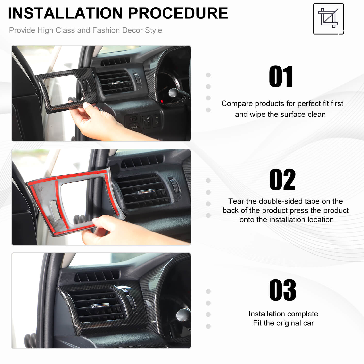 • Step 4: Please do not wash your car keep it away from water and dry for 72 hours / 3 days after installation.